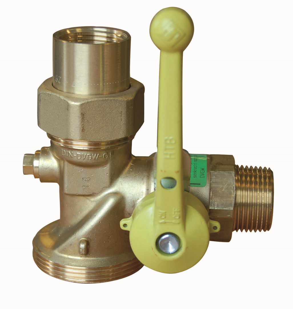 für Einrohrgaszähler, MOP5/C1, mit integriertem Gasströmungswächter Typ K, Betriebsdruck 15 bis 100 mbar, eingangsseitig mit Außengewinde, ausgangsseitig mit Verschraubung mit Innengewinde, mit Prüfschraube G 1/8