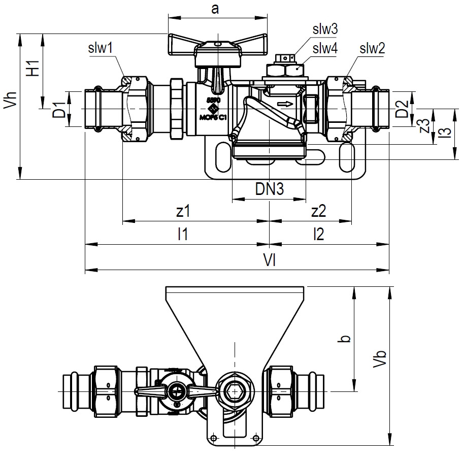 MOP5/C1, mit TAE, mit Montagekonsole, 2 x Pressverschraubung SPS-G für Kupferrohr, mit Prüföffnung DN 15
