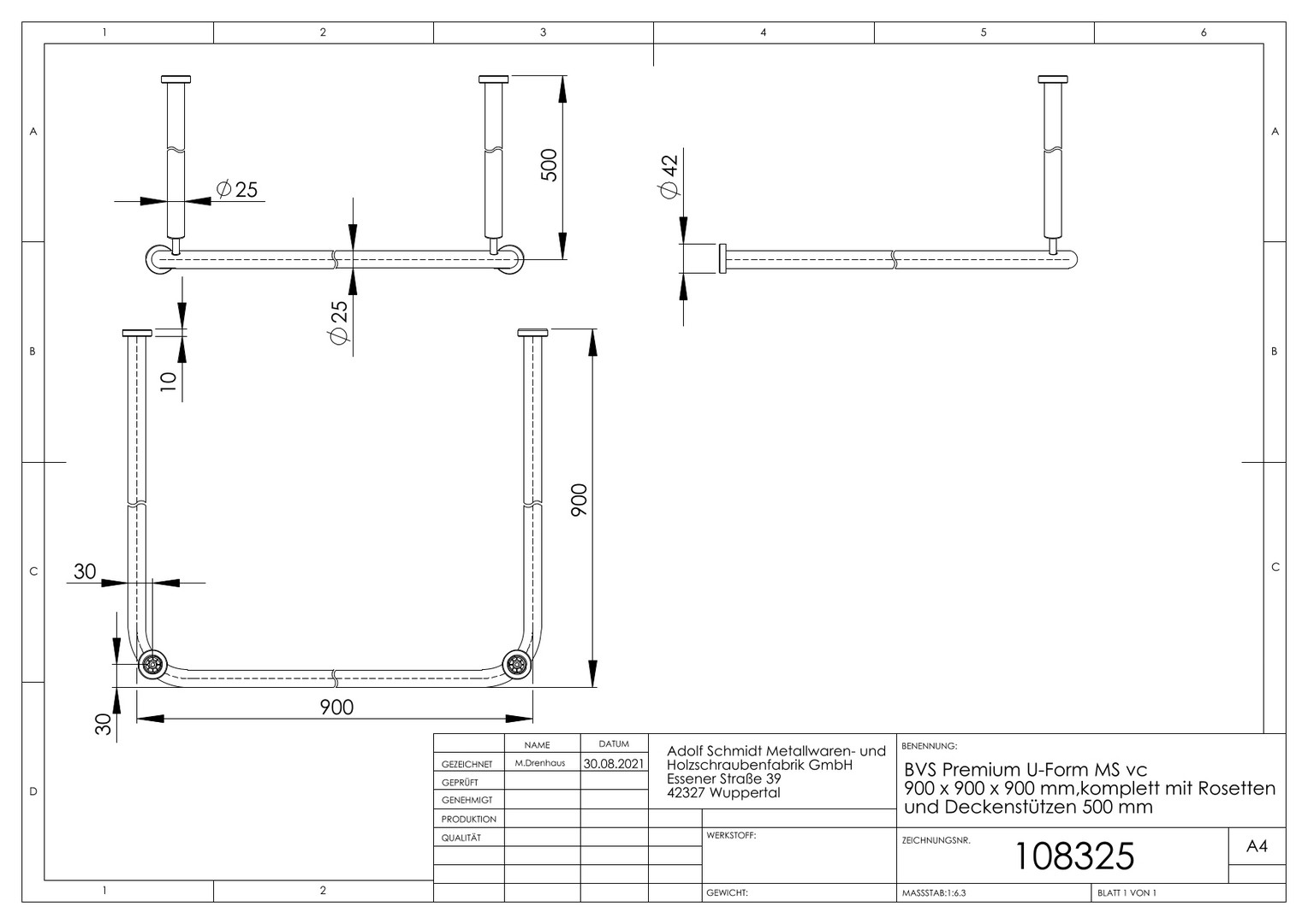 ASW Brausevorhangstange Serie 4000 900 x 900 x 900 mm, d= 25mm, U-Form, Messing verchromt W381641