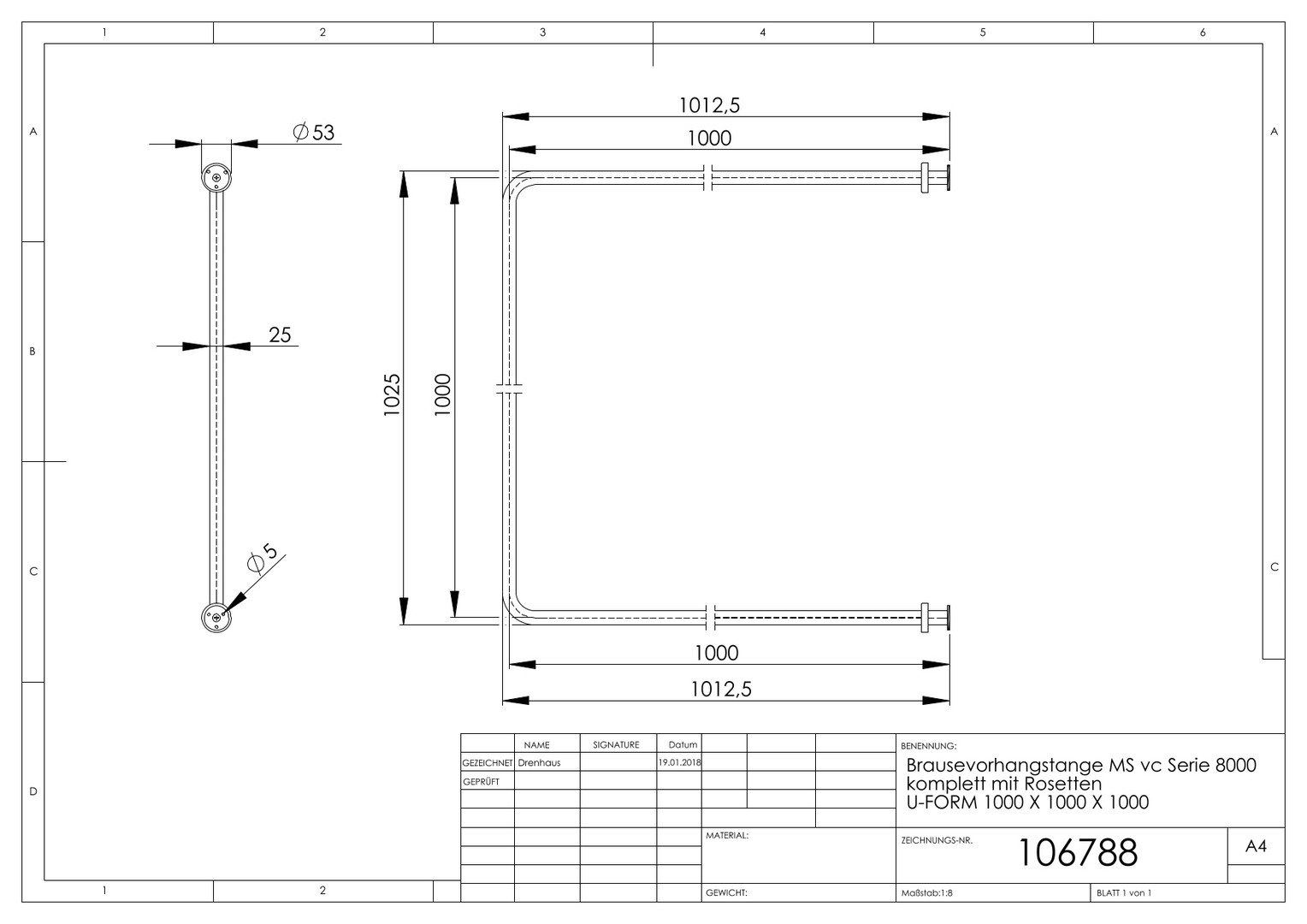 ASW Brausevorhangstange Serie 8000 1000 x 1000 x 1000 mm, d= 25mm, Messing verchromt