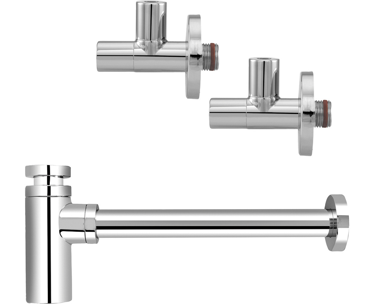 selbstdichtend, bestehend aus Design-Eckventilen 1/2" x 10 mm und Design-Geruchsverschluss 109026 1 1/4" x 32 mm, Wandrohr verschraubt