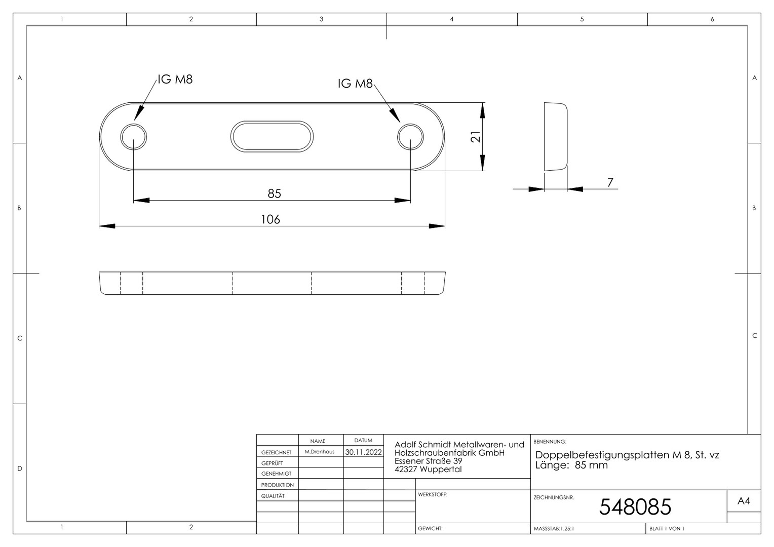ASW Doppelbefestigungsplatte M 8, Länge 85 mm, Stahl verzinkt