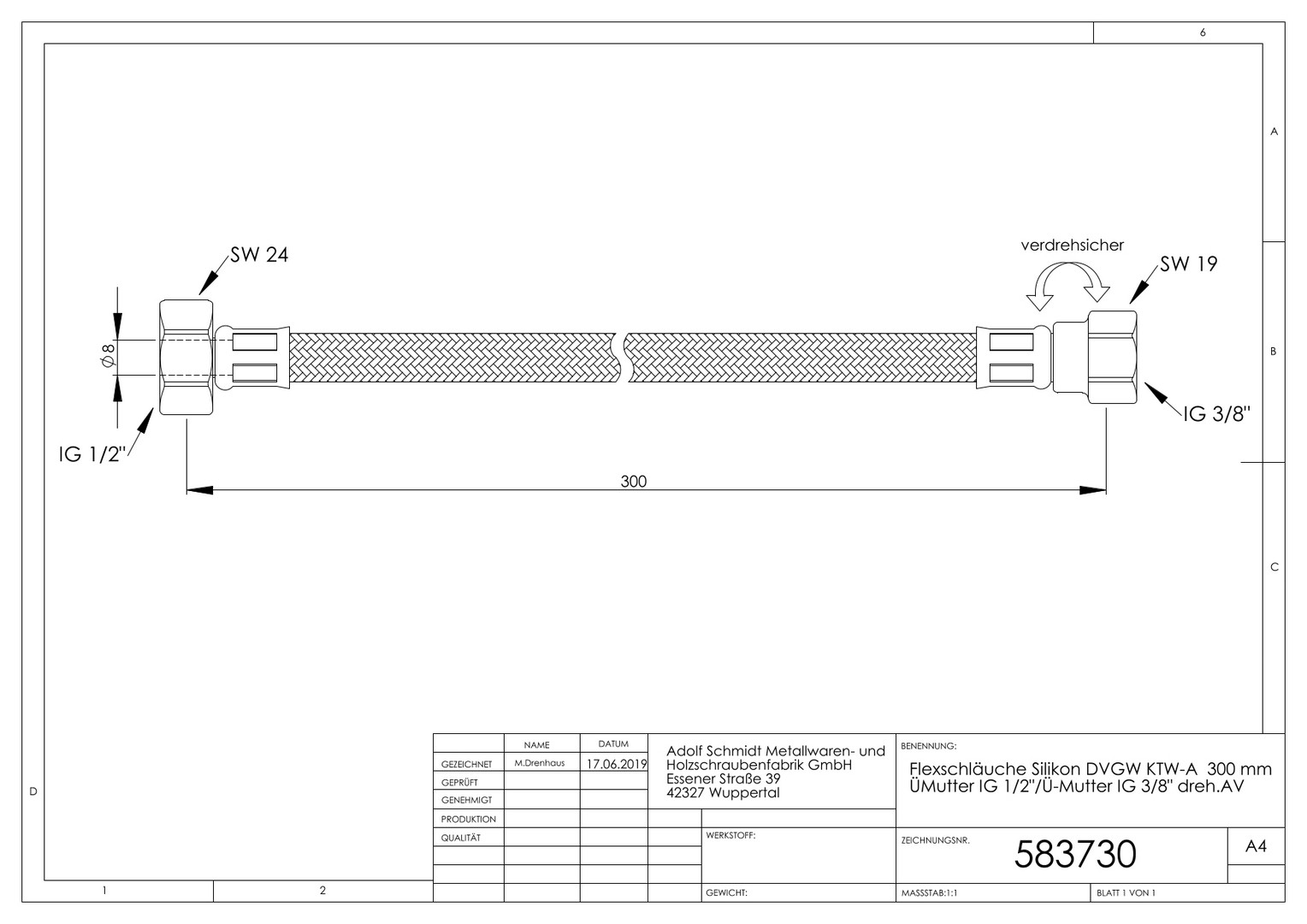 mit Silikon-Inliner, DVGW registriert, geprüft nach KTW-A und W-543, mit Edelstahlumflechtung und integrierten Dichtungen, Innen-Ø 8,2 mm