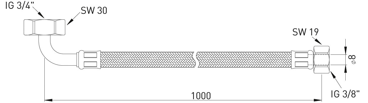 ASW Flex-Trinkwasserschlauch 1000 mm, 3/4" IG Überwurfwinkelx3/8" IG Überwurfmutter