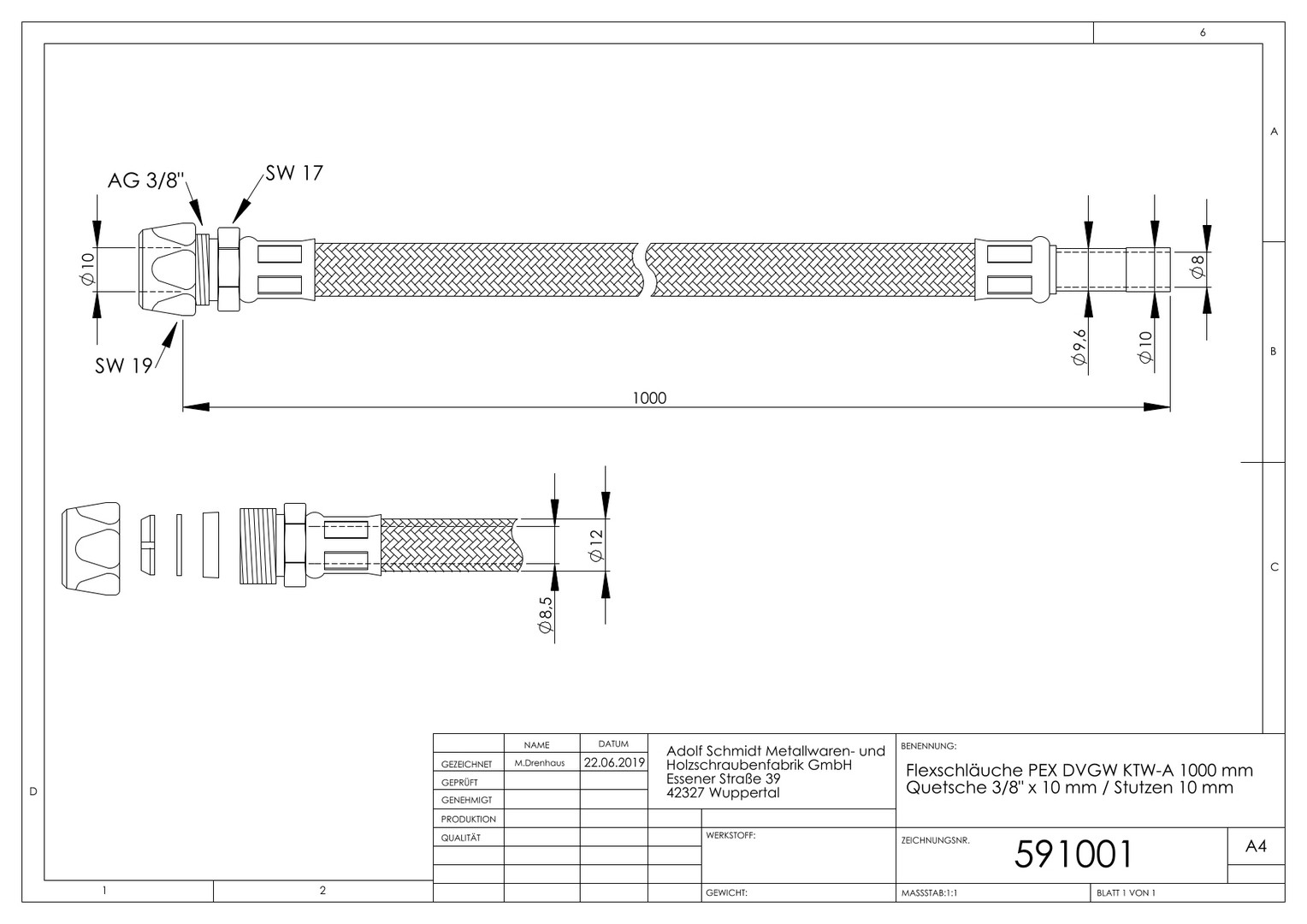 ASW Flex-Trinkwasserschlauch 1000 mm, 3/8"x10mm Quetschverschraubung, 10mm Rohrstutzen