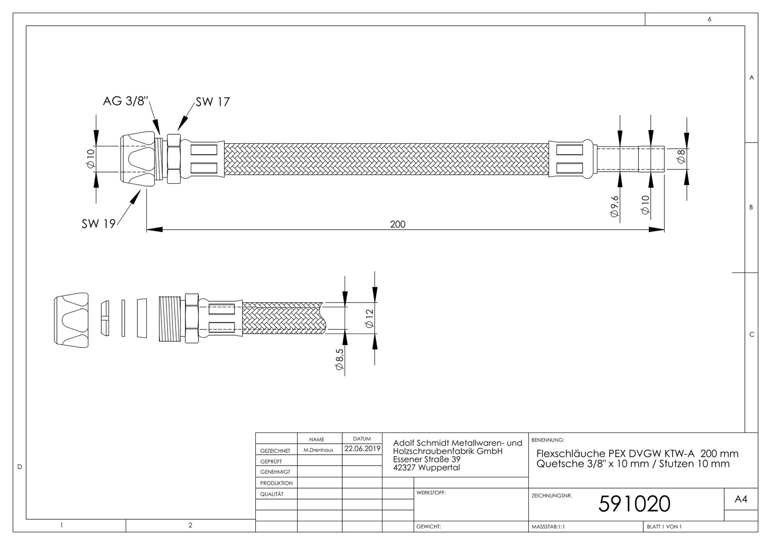 ASW Flex-Trinkwasserschlauch 200 mm, 3/8"x10mm Quetschverschraubung, 10mm Rohrstutzen