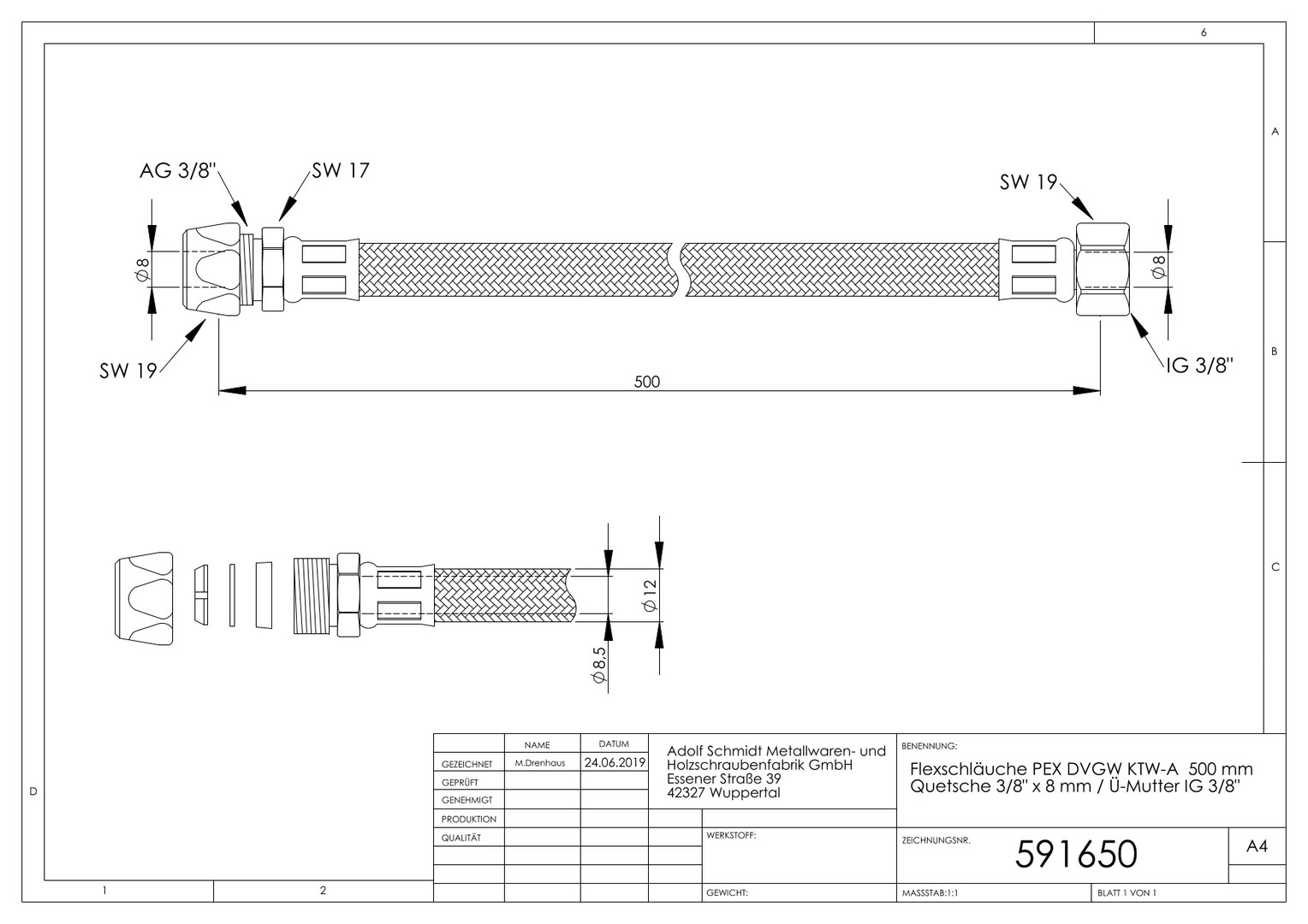 ASW Flex-Trinkwasserschlauch 500 mm, 3/8"x8mm Quetschverschraubung, 3/8" IG Überwurfmutter