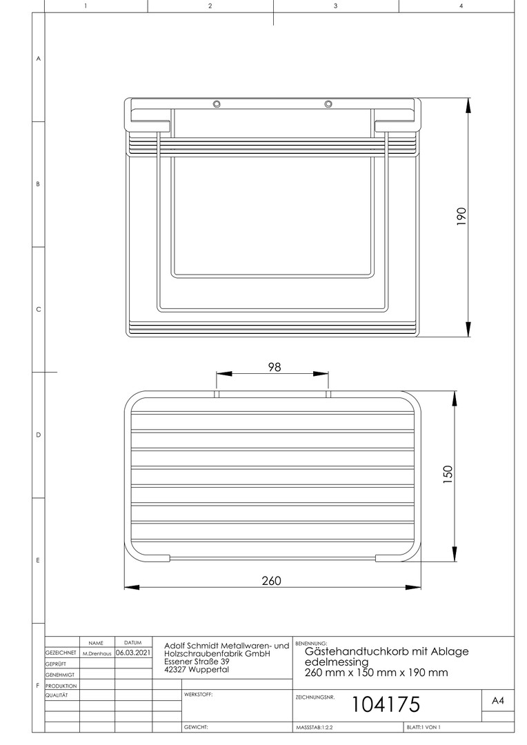 ASW Gästehandtuchkorb offen, 260x150x190mm, mit Ablage, Standard, edelmessing