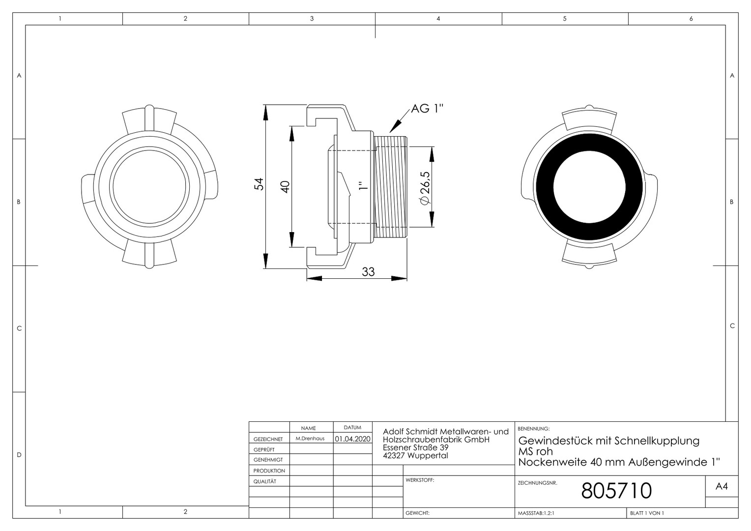 ASW Gewindestück AG 1", Nockenweite 40mm, Messing roh