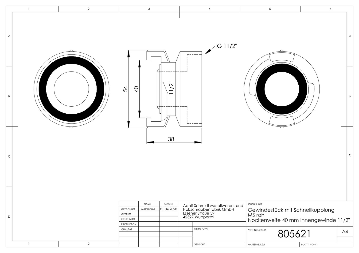 ASW Gewindestück IG 1 1/2"", Nockenweite 40mm, Messing roh