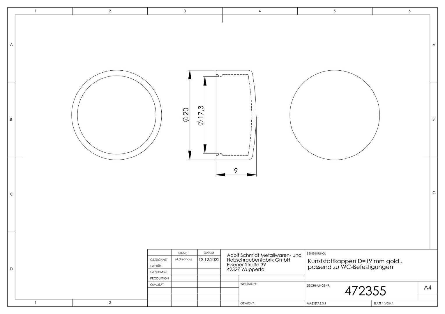 ASW Kappe Ø 19 mm, Kunststoff, zu WC-Befestigung, gold, edelmessing W545963