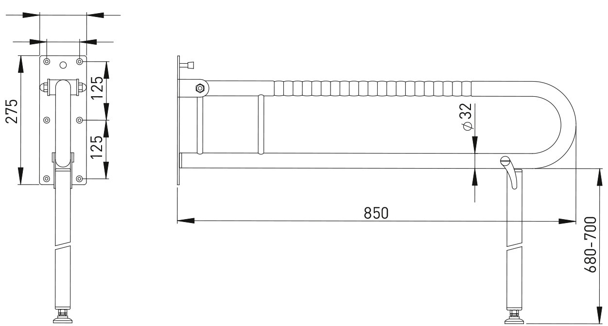 ASW Klappgriff 700 mm, d= 32mm, Edelstahl poliert, mit Bodenstütze W920107