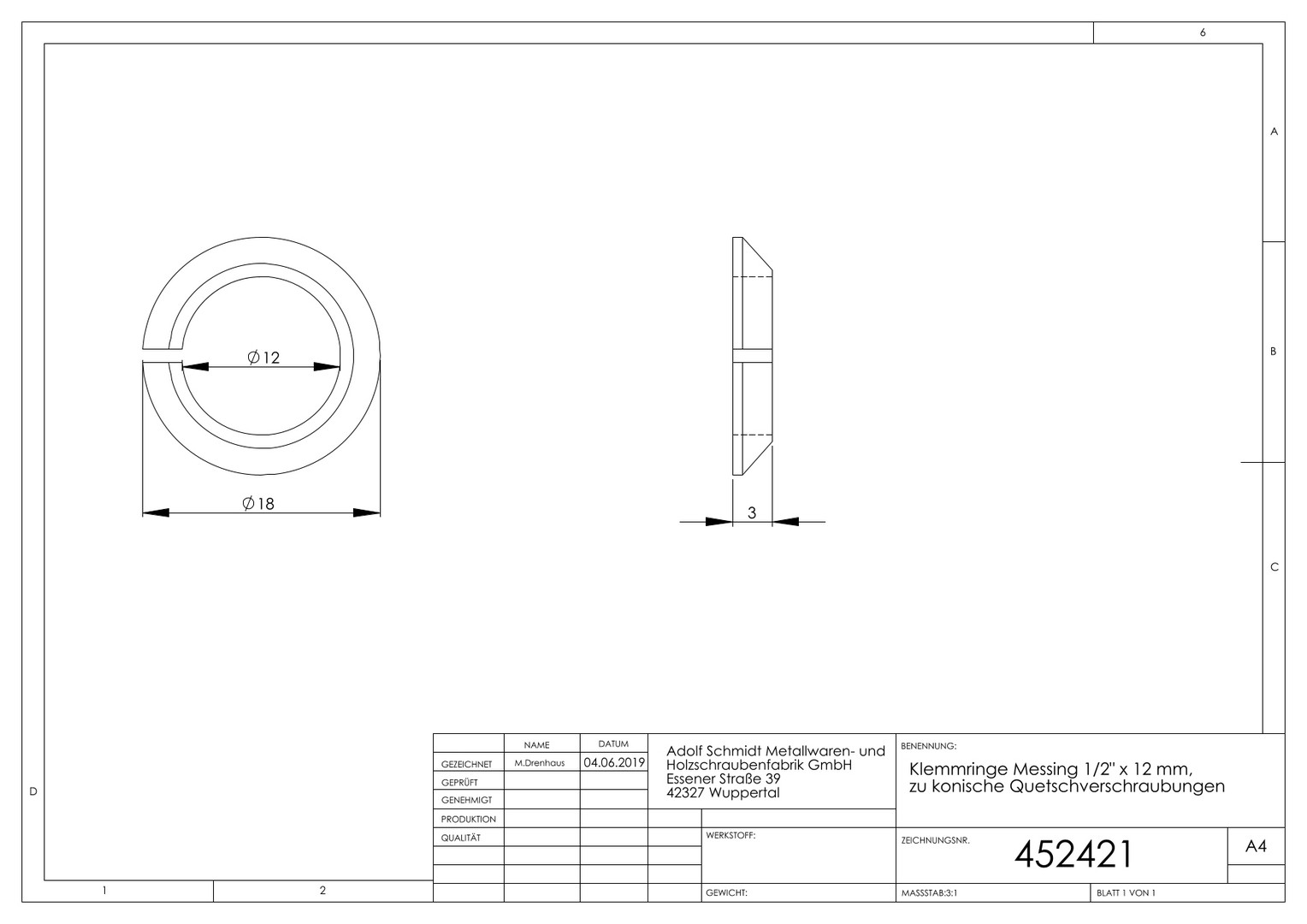 ASW Klemmring 1/2" x 12 mm, Messing, zu konischer Quetschverschraubung