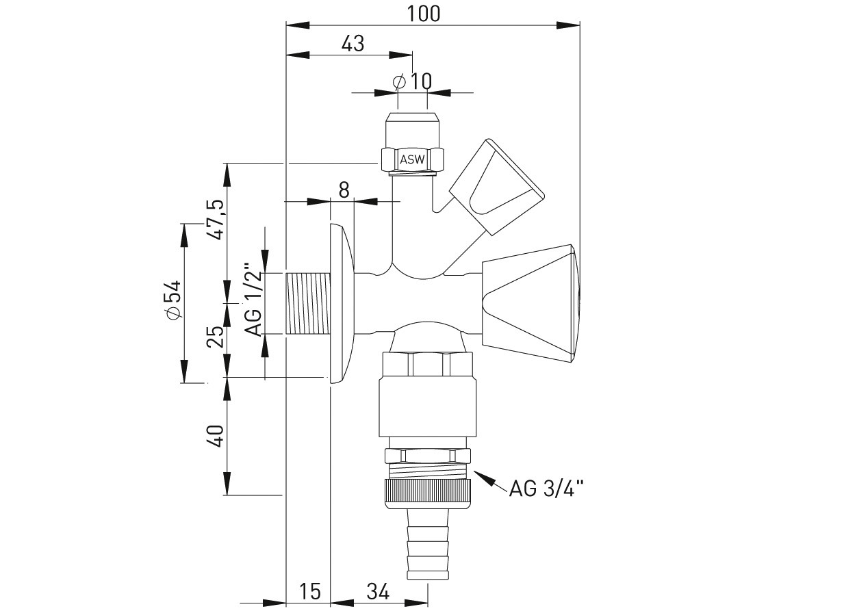 ASW Kombi-Eckventil 1/2" x 10 mm x 3/4", Messing verchromt, mit Rohrbelüfter, für CU-Rohr 10mm