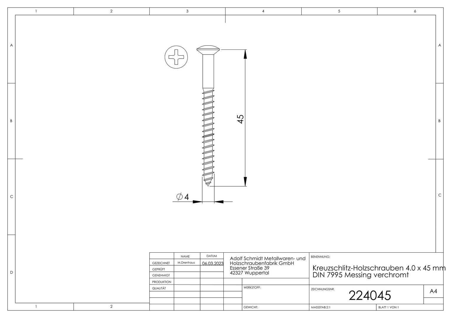 ASW Kreuzschlitz-Holzschraube 4,0 mm x 45 mm, Messing verchromt, DIN 7995