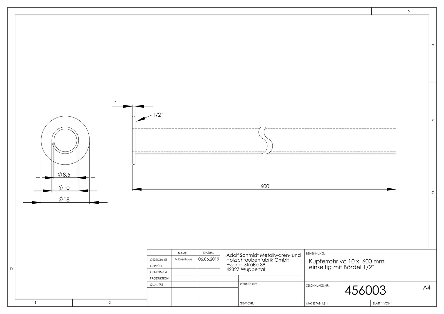 ASW Kupferrohr 10 x 600 mm, einerseits 1/2" Bördel, verchromt