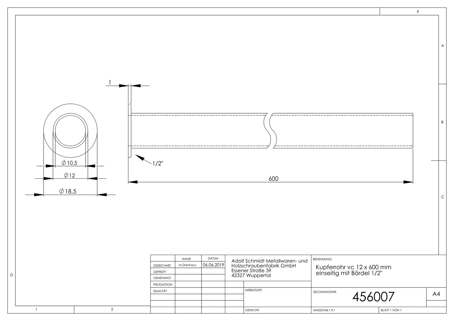 ASW Kupferrohr 12 x 600 mm, einerseits 1/2" Bördel, verchromt