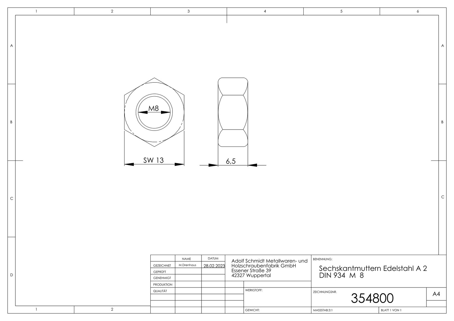 ASW Sechskantmutter M 8, Edelstahl 1.4301, DIN 934/ISO 4032
