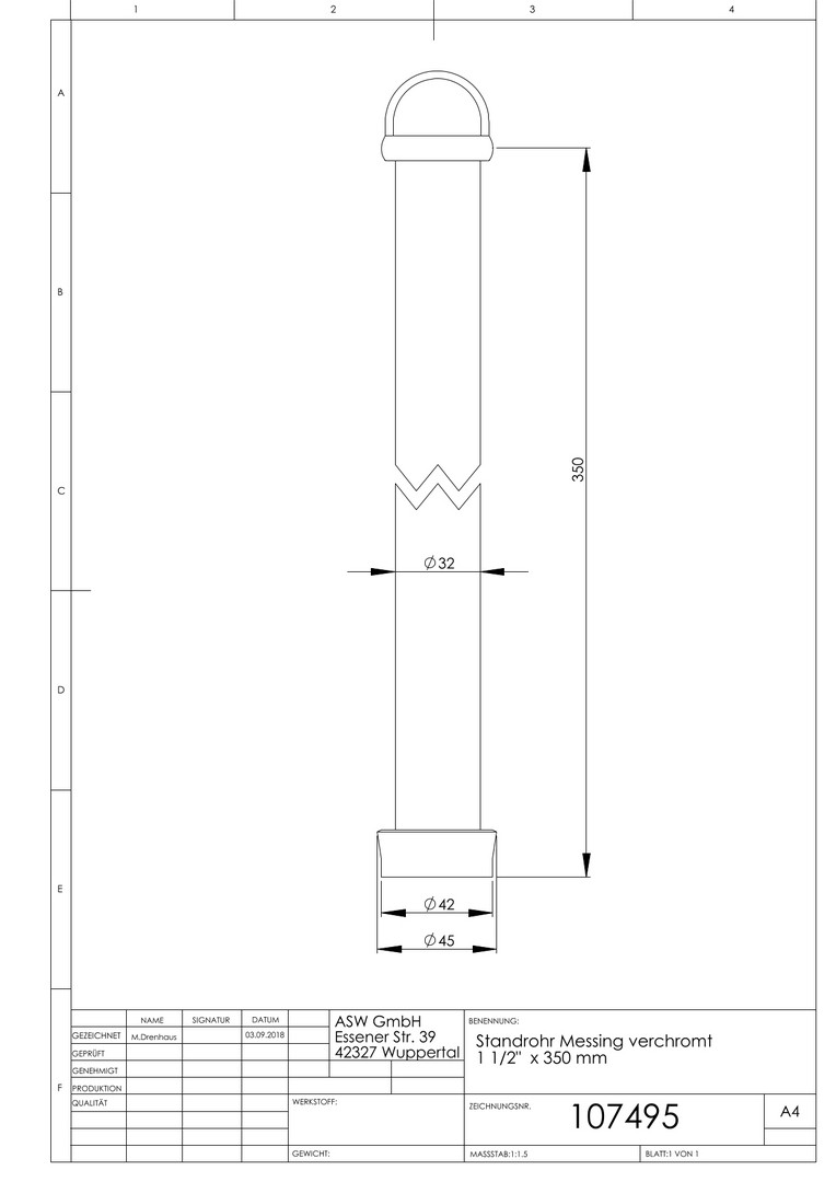 ASW Standrohr 1 1/2" x 350 mm, Messing verchromt