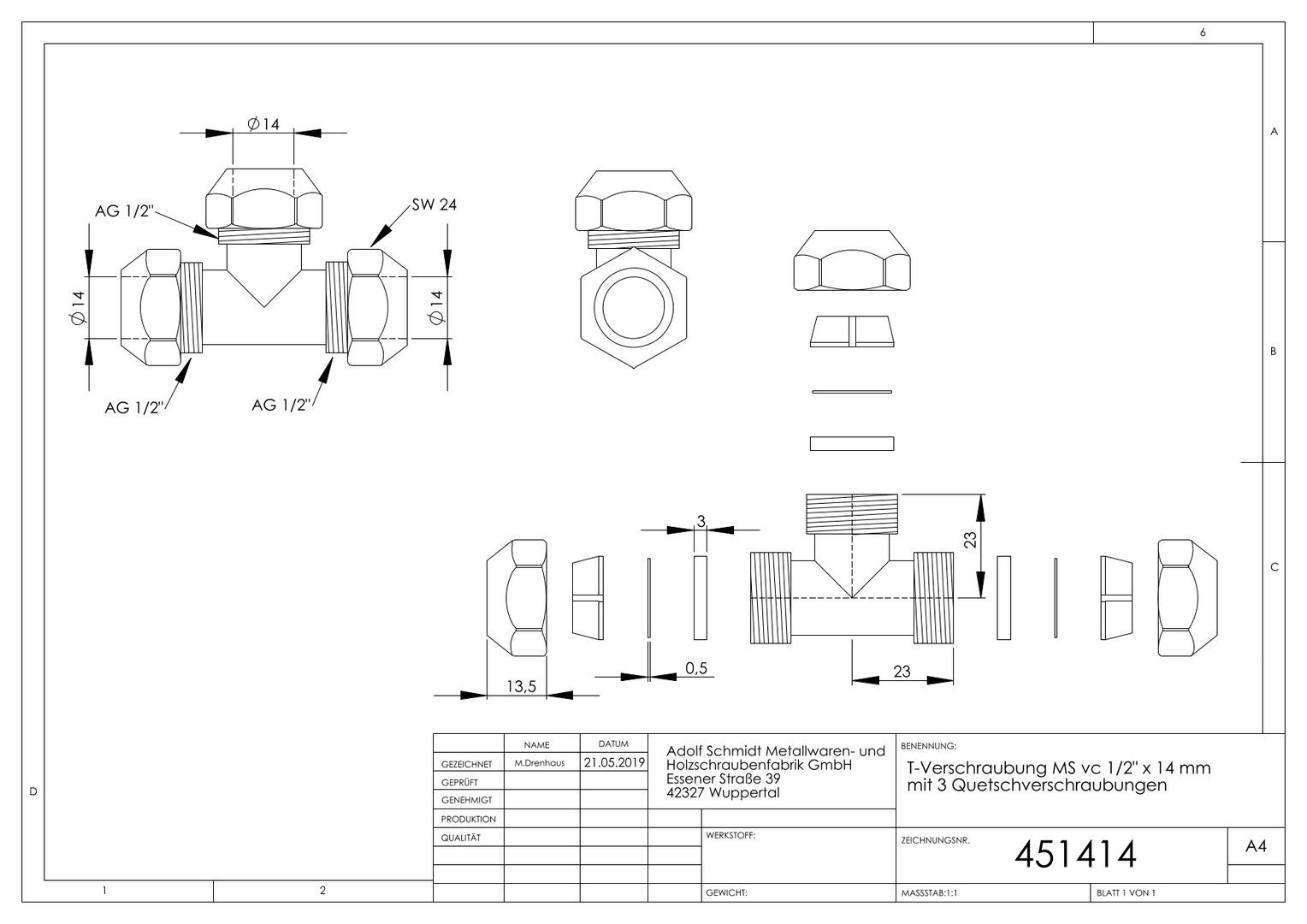 ASW T-Verschraubung 1/2" x 14 mm, Messing verchromt, mit 3 Quetschen W333461