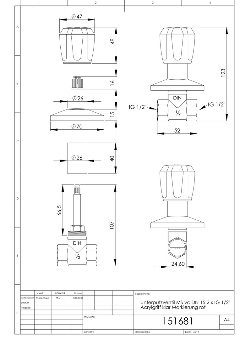 ASW Unterputzventil DN 15, IG 1/2", Messing verchromt, Acrylgriff klar, rot