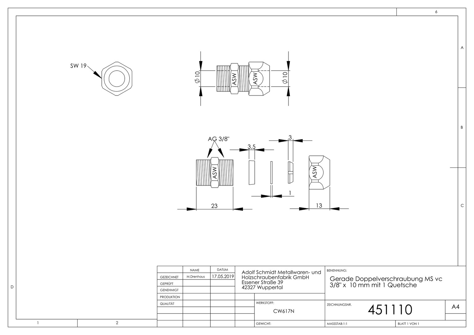 ASW Verschraubung 3/8" x 10 mm, Messing verchromt, gerade, mit 1 Quetsche W333447