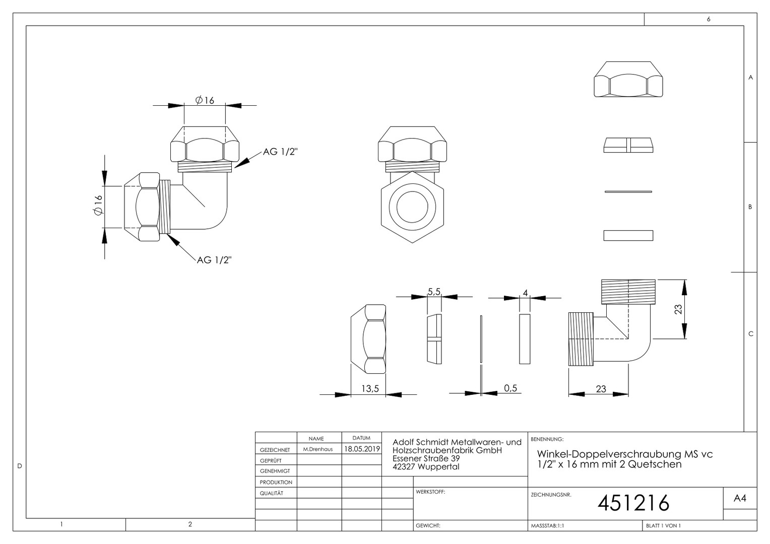 ASW Winkelverschraubung 1/2" x 16 mm, Messing verchromt, mit 2 Quetschen W333456