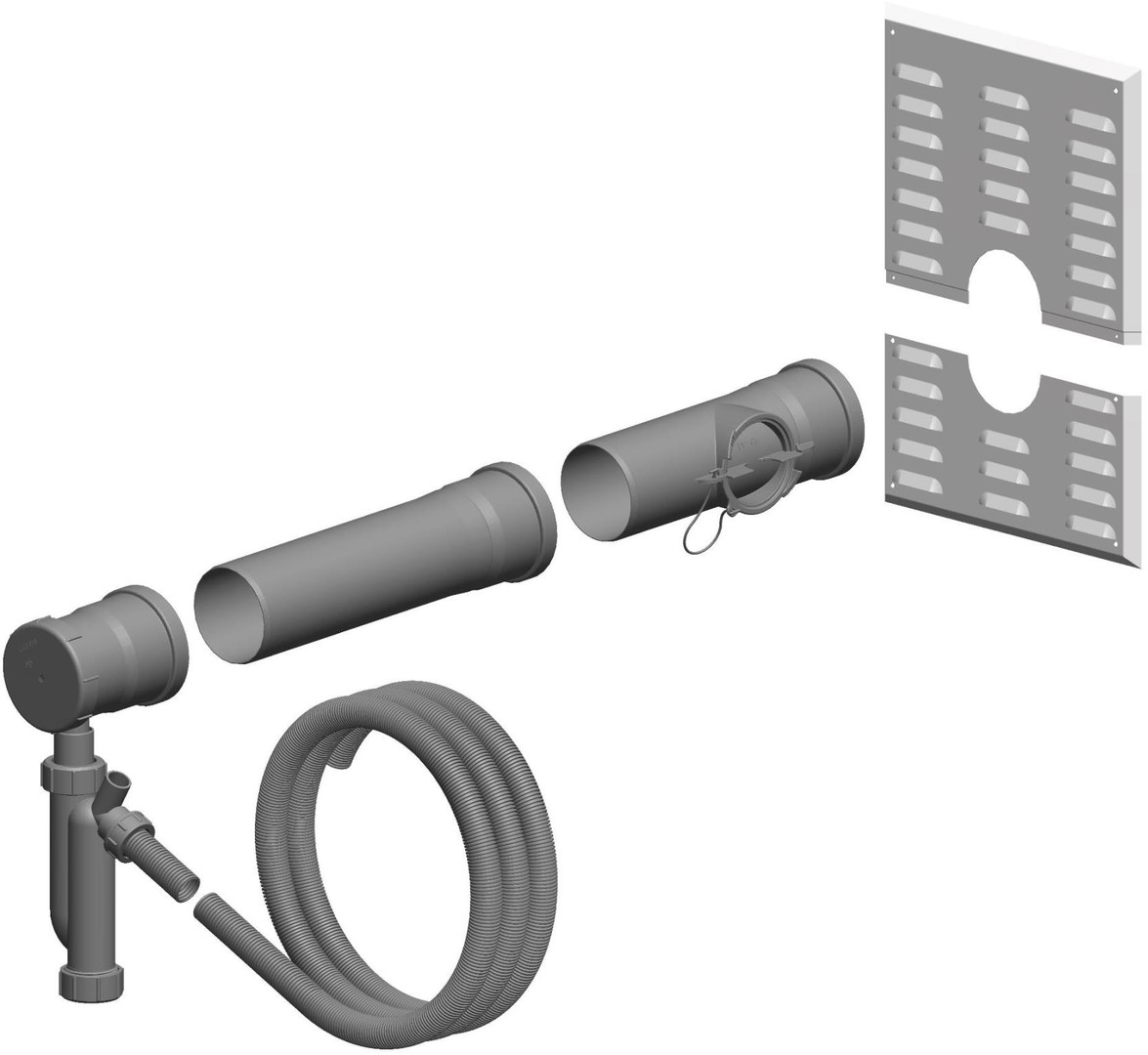 bestehend aus: Endstück mit Kondensatablauf, 2 m Kondensatschlauch, Siphon, Rohr 255 mm, Kontroll-Rohr, Wandblende mit Hinterlüftung