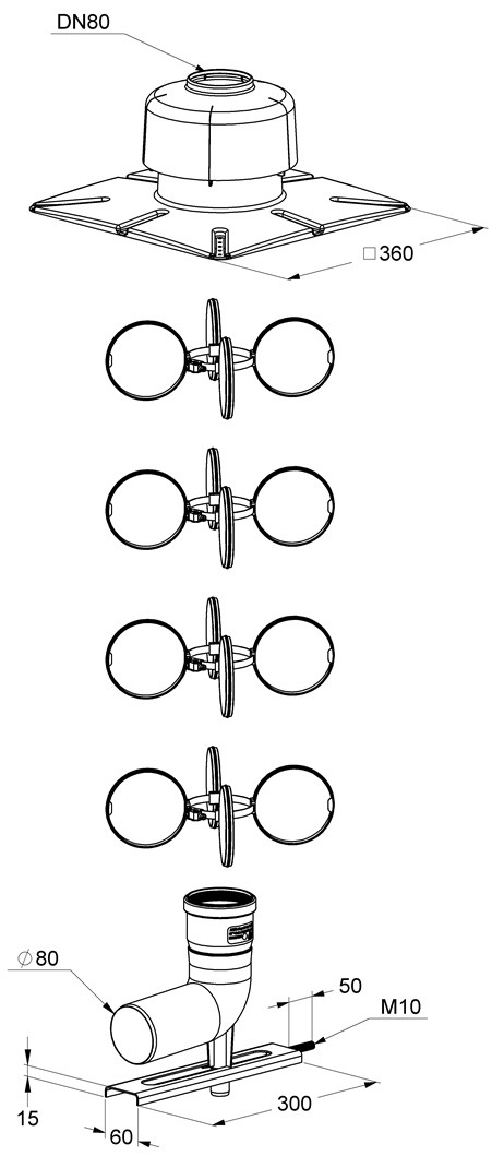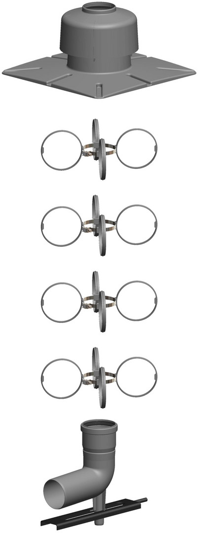 bestehend aus: Schachteinführung mit Auflager, Abstandhalter 4x, Mündungs-Set Kunststoff mit Befestigung, ab DN 200 ohne Auflager, 87°-Bogen mit Schachteinführungsstütze