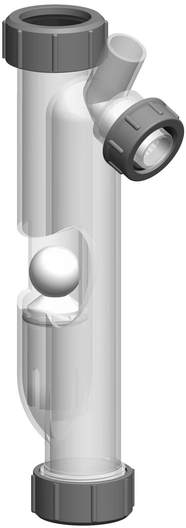 Sperrwasserhöhe 90/150/150/200/220 mm, Differenzdruck 883/1471/1471/1961/2157 Pa, Eintritt 32 mm, Austritt 21 mm, mit Schraubgewinde, Kugel verhindert den Austritt von Abgasen in die Kanalisation bei Druckstößen z. B. von BHKWs, für den Anschluss an verschiedene Kondensatabläufe, ohne CE-Kennzeichnung