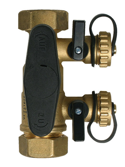 für thermische Solaranlagen als Befüll- und Spüleinrichtung, mit Kugelhahn, zwei KFE-Hähnen G 3/4, Prozessanschluss G1 mit Überwurfmutter und beidseitig Klemmringverschraubung Ø 22 mm, Baulänge 108 mm, Gehäuse aus Messing