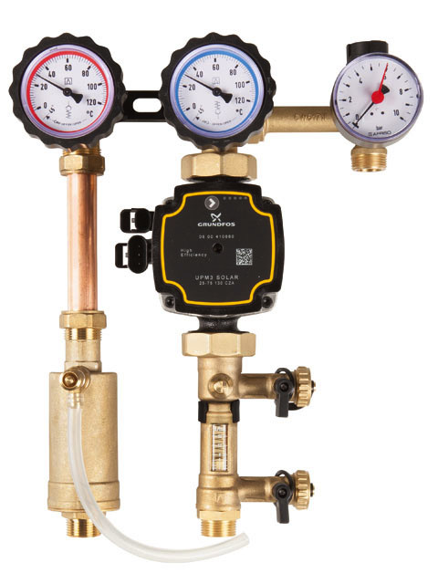 zur Verbindung von Kollektor und Speicher in eigensicheren, geschlossenen thermischen Solaranlagen, wälzt Wärmeträgerflüssigkeiten wie z. B. Wasser-Glykol-Gemische im Gesamtsystem um, komplette und fest vormontierte und auf Dichtheit geprüfte Solarpumpengruppe/-strang mit allen erforderlichen Sicherheits- und Funktionsbauteilen, mit Isolation (dient gleichzeitig als sichere Transportverpackung), das Sicherheitsventil entspricht der Druckgeräte-Richtlinie 2014/68/EU, Achsabstand 100 mm, Systemanschluss G 3/4 AG, Temperatureinsatzbereich Umgebung Tmax= 40 °C, Temperatureinsatzbereich Medium Tmax= 120 °C (kurzzeitig Tmax= 160 °C), Anlagendruck max. 6 bar, Isolation aus Polypropylen EPP, Umwälzpumpe Grundfos UPM 3 Solar 25-75 (Baulänge 130 mm, Schutzart IP 42), Leistungsaufnahme/Förderhöhe 19 W/4,5 m/28 W/5,5 m/35 W/6,5 m/45 W/7,5 m