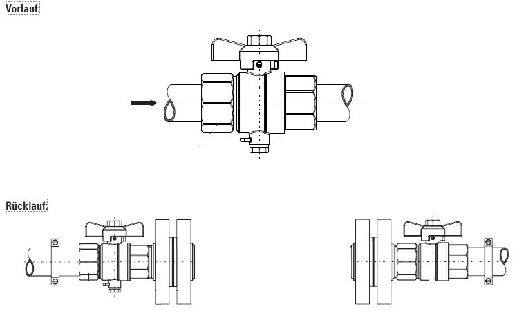für Direktmessung (EN1434), Vorlaufkugelhahn mit integrierter Impfstelle, 2x Absperrorgane für Rücklauf, davon 1x Impfstelle