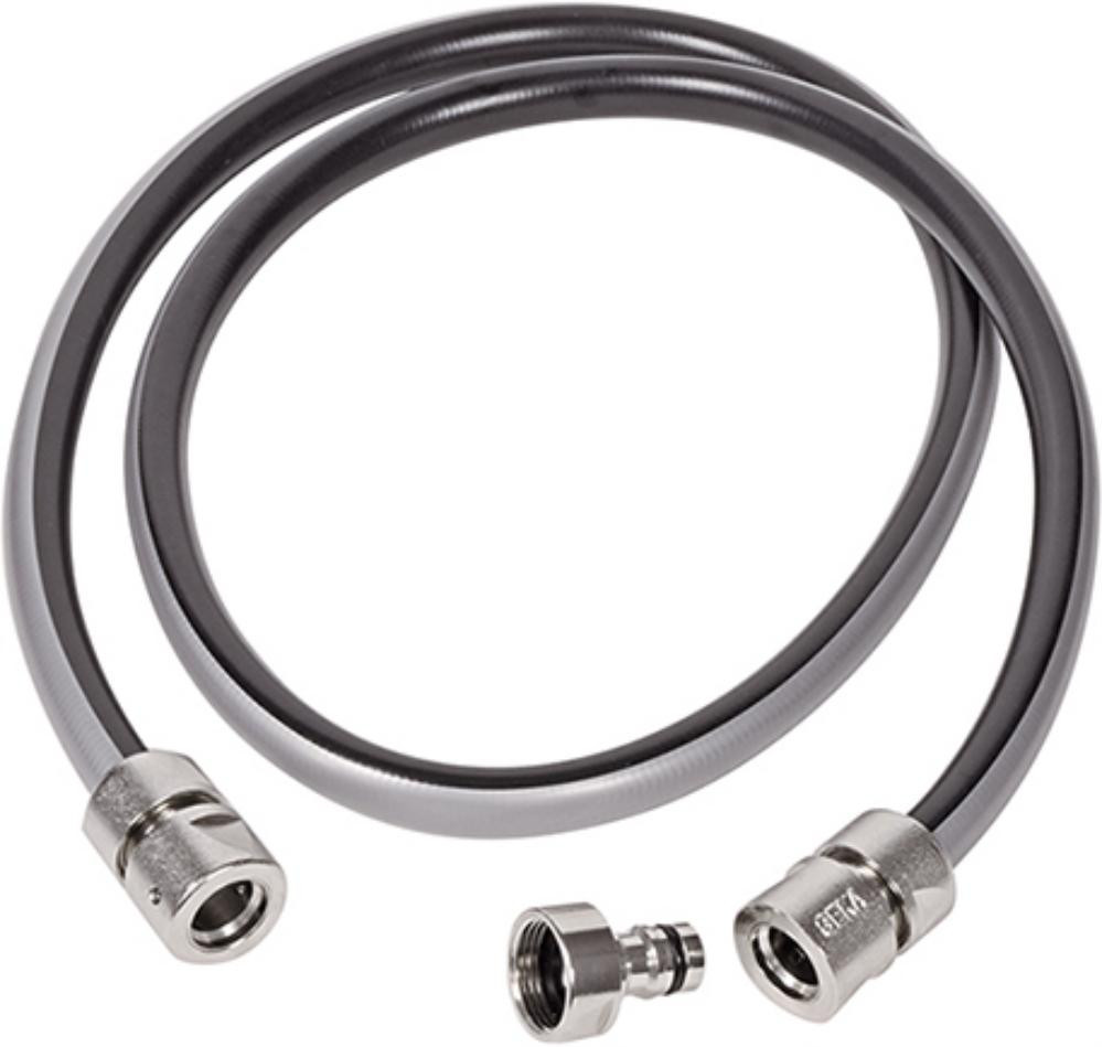 • Das Set enthält alle notwendigen Anschlussteile: GEKA®plus-Hahnstecker 3/4" (711X), GEKA®plus-Schlauchstück 1/2" (701X), GEKA®plus-Schlauchstück mit Wasserstopp 1/2" (741X), 1,5 m Schlauch 1/2"