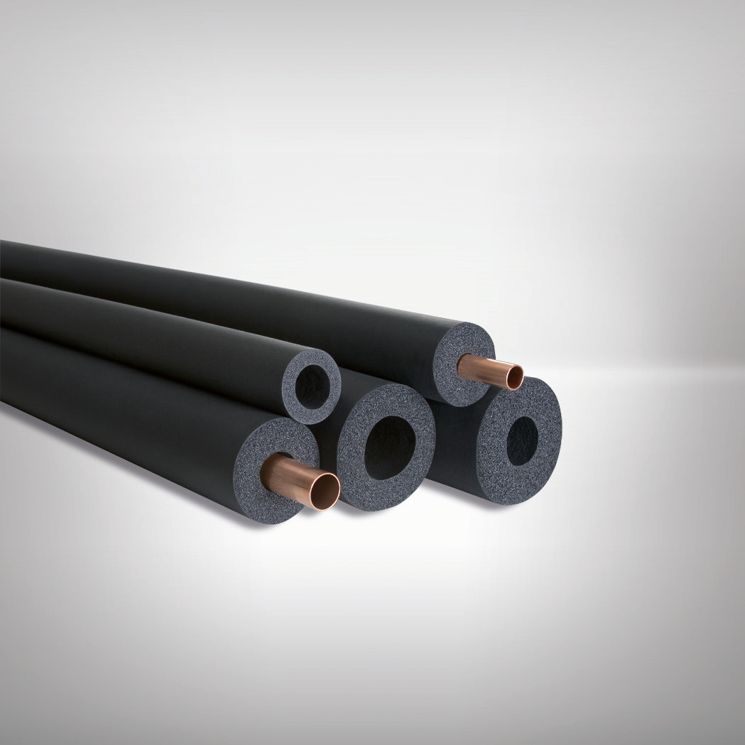 flexibler Elastomerschaum mit feuerhemmenden Eigenschaften, geringer Rauchentwicklung, geschlossenzelliger Materialstruktur und integriertem antimikrobiellem Schutz durch Microban, geeignet für den Einsatz in HLK, Kälte- und verfahrenstechnischen Anlagen, Elastomerschaumstoff auf Basis von synthetischem Kautschuks, werkseitig hergestellter flexible Elastomerschaumstoff (FEF) gem. EN 14304, Haftkleber-Beschichtung auf modifizierter Acrylat-Basis mit Gitternetzstruktur, Abdeckung aus Polyethylen-Folie, die Schutzfolie der Klebeschicht von selbstklebenden Produkten kann Spuren von Silikon enthalten, Dämmung und Schutz von Rohren, Luftkanälen und Behältern (mit Rohrbogen, Armaturen, Flanschen) in Kälte- und Klimaanlagen sowie verfahrenstechnischen Anlagen, zur Tauwasserverhinderung und Energieeinsparung