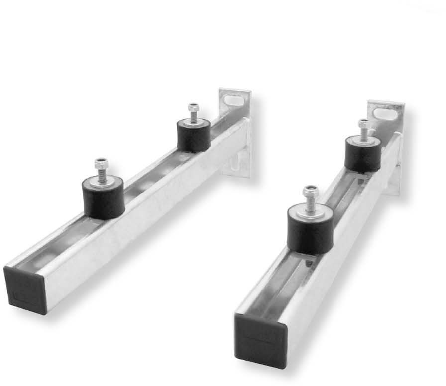 universeller Befestigungssatz zur Wandbefestigung von Klimaanlagen, Heizapparaten, Kompressoren und anderen schweren Geräten, Schwingungsdämpfer mit vormontierter Schiebemutter, Unterlegscheibe und Sechskantgegenmutter vormontiert auf Wandkonsole, Schallschutz mittels Schwingungsdämpfer (Stützen aus vulkanisiertem Gummi), bestehend aus 2x Wandkonsole aus Strut 41 x 41 mm, 4x Schwingungsdämpfer, 2x Schienenendstopfen