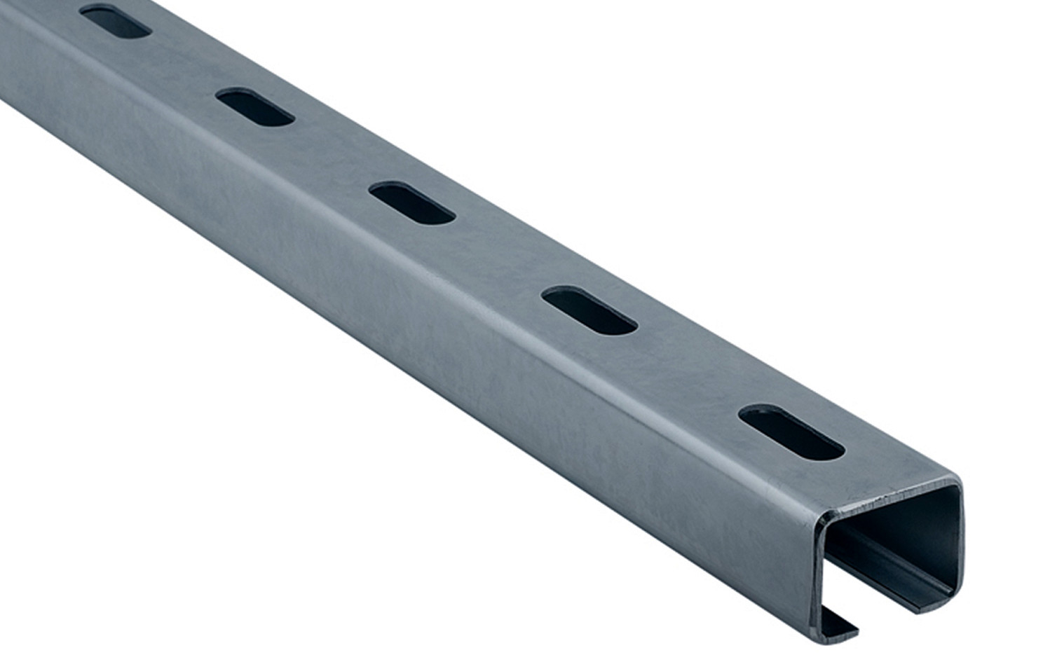 zur schnellen Befestigung von Rohren und komplexen Rohrkonstruktionen, C-Profil, für eine schnelle und einfache Befestigung, gleichmäßiges Lochbild, der Abstand zwischen Schienenende und erster Lochung ist immer gleich, Material aus Stahl 1.0242, sendzimirverzinkt