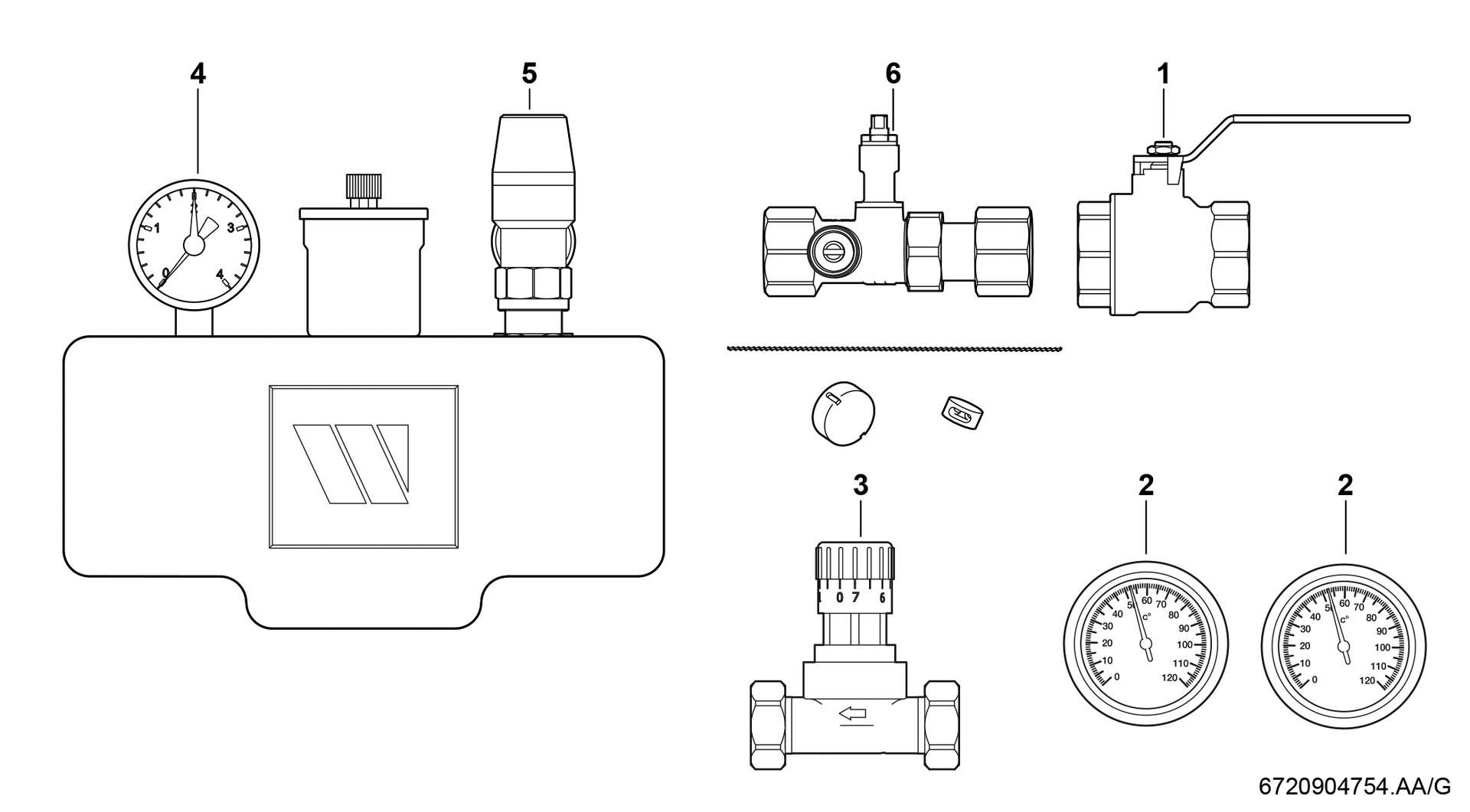 mit Differenzdruck Überströmventil 3/4", 2 Thermometer, Sicherheitsgruppe 1" mit Manometer, Sicherheitsventil 1/2", Schnellentlüfter