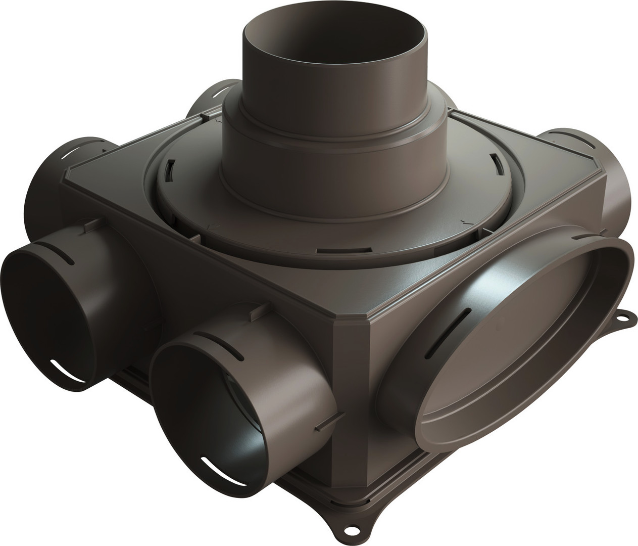 mit bis zu 6 Rundrohranschlüssen DN 75 oder 6 Flachkanalanschlüssen, für Flachkanalanschluss Verbinder FKV 140-1 in entsprechender Anzahl erforderlich, Kombination aus Rund- und Flachkanal möglich, 3x Stopfen VKS lose im Lieferumfang, Revisionsöffnungen an der Ober- oder Unterseite sowie seitlich (ovale Öffnung), Verschlussdeckel für Revisionsöffnungen werkseitig montiert, flexible Montagemöglichkeiten (für flache Wand/Boden/Deckenmontage), Hauptleitungsanschluss lose im Lieferumfang, Montage an Ober- oder Unserseite möglich: DN 100, DN 125, Abmessungen 318 x 299 x 109 mm-Hauptleitungsanschluss nicht montiert, für Anlagen mit Vent 4000 CC