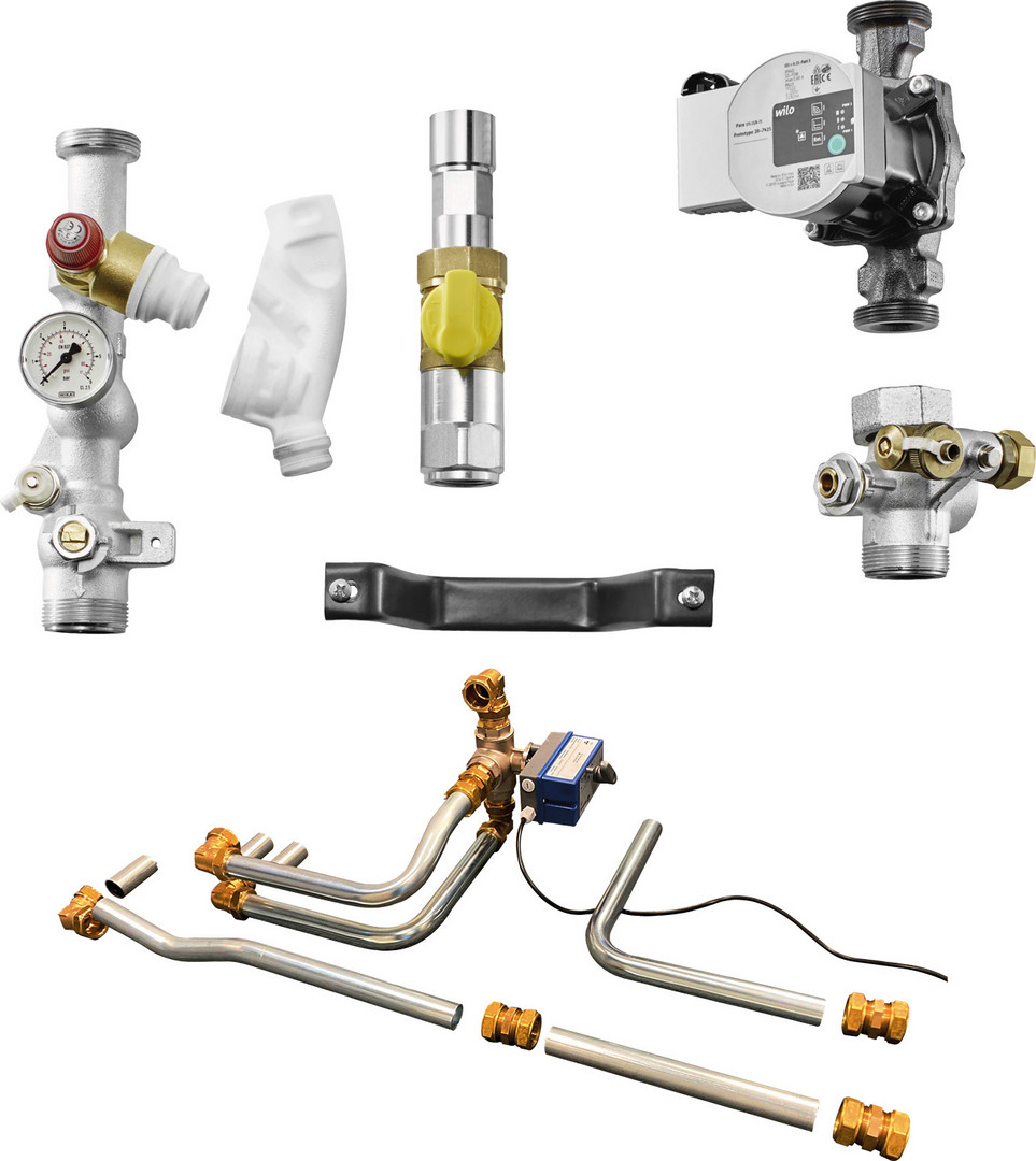 Montage am ersten Gerät, Warmwasserbereitung über das erste Gerät der Kaskadenunit über 3-Wege-Ventil, Energiesparpumpe Wilo Para STG 25/8-75, Sicherheitsventil 3 bar, Rückschlagklappe, bestehend aus Verrohrung, 3-Wege-Ventil 1 1/4", DN 32, Wartungshähne, Isolierung, Bauteil ersetzt Pumpengruppe für dieses Gerät, geeignet für die Leistungsgröße bis 70 kW, Gashahn mit integriertem Brandschutzventil