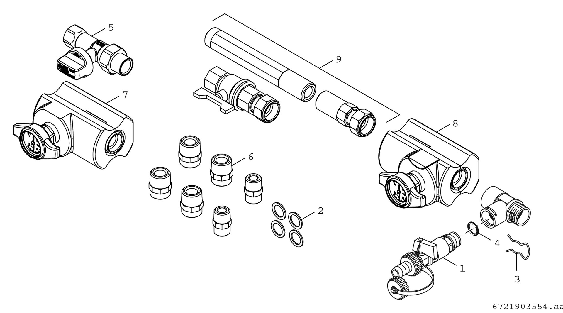 2x Wartungshähne R 3/4, Durchgangsform, 1x Gashahn 1/2", Durchgangsform, mit thermischer Absperrvorrichtung, T-Stück mit steckbarem Entleerhahn, Trinkwasserabsperrhahn R 3/4