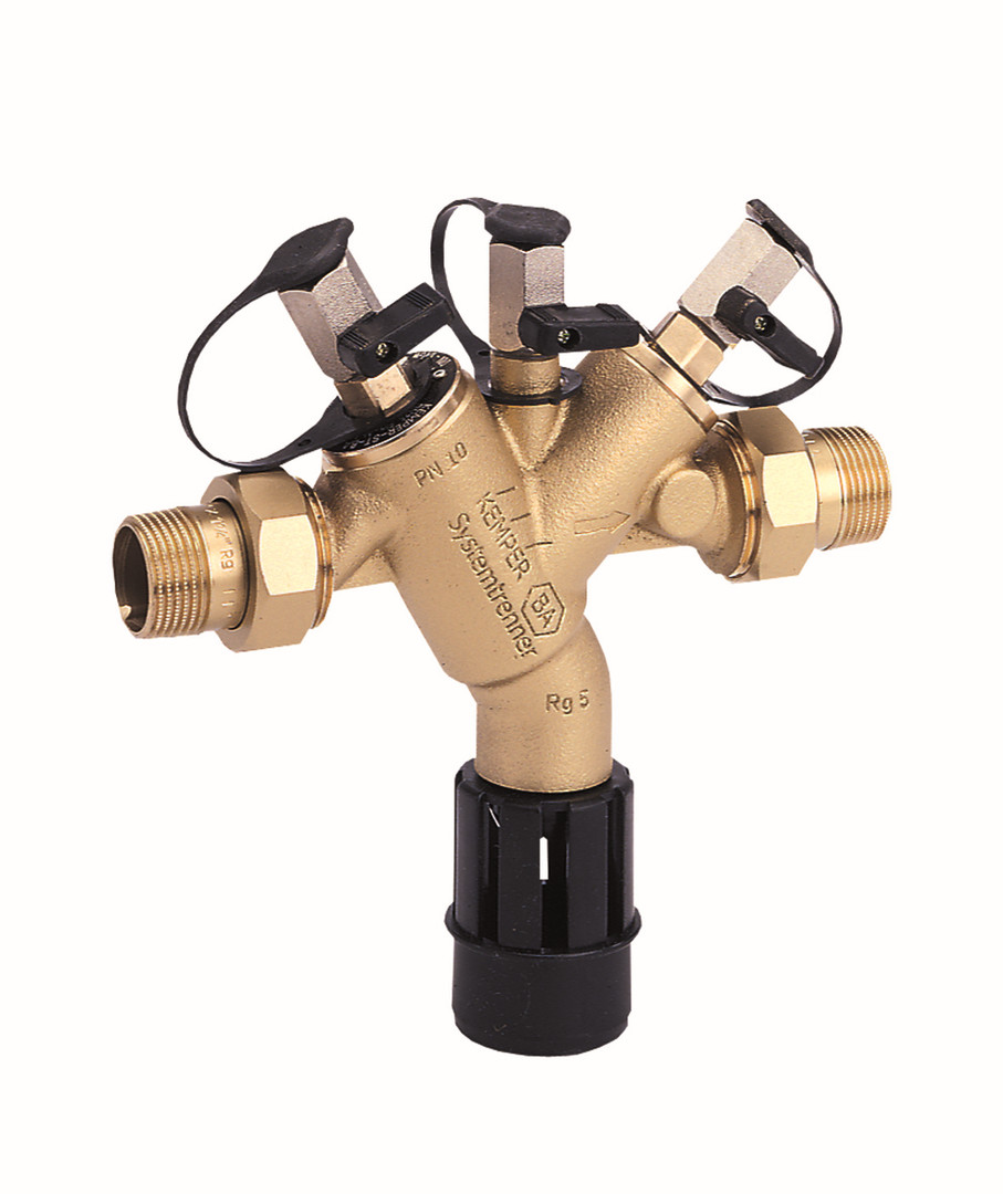 der Ansprechdruck spielt systembedingt (Einsatz von Rückflussverhinderer) keine Rolle mehr, Fremdenergie ist nicht erforderlich, es kann keine Luft mehr in das Leitungsnetz eingetragen werden, Zulassung wie Rohrtrenner Einbauart 2 und Gefahrenklasse 1-4, Gehäuse aus Rotguss (DN 20-65) bzw. Grauguss DN 80, Epoxidbeschichtet (DN 80), Feder und Ventilsitz aus Edelstahl, verschließbare Anschlüsse für Druckmessgeräte, Rückflussverhinderer Wassereingang, Entlastungsventil in Mittelkammer, Rückflussverhinderer für Wasserausgang, Nenndruck PN 10, Temperatur max. 60 °C