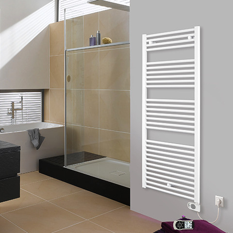 für reinen Elektrobetrieb mit Heizstab mit Raumtemperaturregler für die Erwärmung von Handtüchern und Textilien und zur Raumerwärmung, horizontale Rundrohre 23 mm mit vertikalen rundum glatten Halbovalrohren 30 x 40 mm verbunden, mit 2-3 Aufnahmeöffnungen für Handtücher, mit Wärmeträgerflüssigkeit gefüllt (Frostschutz bis -6 °C), Heizstab mit Regler ist serienmäßig im rechten Sammelrohr montiert, durch Wenden des Heizkörpers und Drehen des Reglers kann der Heizkörper auch mit Heizstab links montiert werden, nicht genutzte Anschlüsse mit Blindstopfen DN 15 mit Innensechskant wasserdicht verschlossen, Widerstandsheizstab mit Thermosicherung und Tauchkörper aus Edelstahl mit DN 15 Anschlussgewinde mit O-Ring, Thermostat mit ca. 0,8 m Anschlusskabel und Schutzkontaktstecker, Netzspannung 230 V/50 Hz, Klasse II, IP 44, Digitales Uhrenraumthermostat mit integriertem Infrarotsensor für optional erhältliche IR Fernbedienung, mit 7 voreingestellten Programmen, individuell programmierbare Tages- und Wochenprogramme (Chrono-Modus), Komfortmodus, Nachtmodus, Frostschutzmodus, Fil-Pilote-Modus, Timer für 2 h, Standby-Modus (ohne Heizfunktion) und Funktion geöffnetes Fenster, Einstellbereich 7-32 °C, Gehäuse nach Wahl weiß oder chrom, 130 x 68 x 40 mm (BxHxT), Oberfläche pulverbeschichtet DIN 55900 und bei ca. 180 °C eingebrannt, mit 3 Wandbefestigungen mit Schrauben und Dübeln, erfüllen AK 3 nach VDI 6036, Entspricht den Richtlinien der gesetzlichen Unfall-Versicherer (GUV)