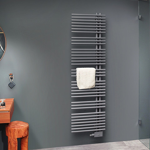 für Zentralheizung (zusätzliche Ausstattung mit Elektroheizstab) und für die Erwärmung von Handtüchern und Textilien, gerade Horizontal-Rundrohre 23 mm im Spezialschweißverfahren mit den vertikalen Rundrohren 30 mm wasserführend verbunden, symmetrische Anordnung der unterschiedlichen Rohrgruppen macht Asym über Kopf wendbar, wahlweise offene Seite rechts oder links), Vertikal-Rohre im Abstand von 50 mm für Vor- und Rücklauf positioniert, mit Anschlüssen DN 15 x 50 mm einseitig unten und oben, Oberfläche pulverbeschichtet DIN 55900 und bei ca. 180 °C eingebrannt, serienmäßiges Zubehör: 2 Entlüftungsstopfen DN 15 und 4 Befestigungen aus Stahl, mit Sechskant-Holzschrauben und Dübeln, Wärmeleistung nach DIN EN 442-2, Heizmedium Wasser: max. zul. Betriebstemperatur 100 °C, max. zul. Betriebsüberdruck 6 bar