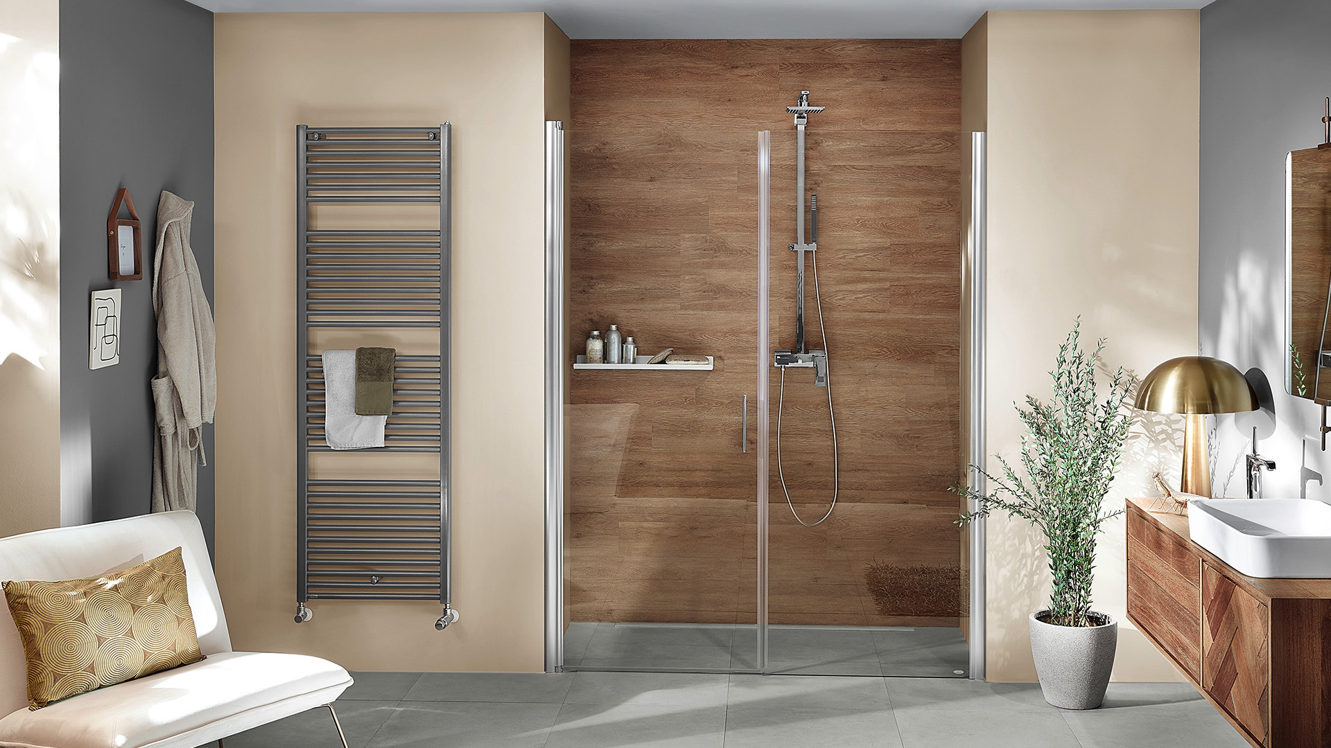für Zentralheizung (zusätzliche Ausstattung mit Elektroheizstab) und für die Erwärmung von Handtüchern und Textilien, horizontale Rundrohre 23 mm mit vertikalen Halbovalrohren 30 x 40 mm verbunden, mit 2-3 Aufnahmeöffnungen für Handtücher, senkrechte Halbovalrohre mit rundum glatter Oberfläche, wendbar, 2 Anschlüsse DN15 von unten und 1 Entlüftungsanschluss DN15 oben, Oberfläche pulverbeschichtet DIN 55900 und bei ca. 180 °C eingebrannt, serienmäßiges Zubehör: Entlüftungsstopfen DN 15 in vernickelter Ausführung mit Spezialdichtung, 3 tiefenverstellbare, von vorn fixierbaren Befestigungen erfüllen AK 2-3 nach VDI 6036 je nach Baugröße, mit 3 Sechskant-Holzschrauben und Dübeln, Wärmeleistungen nach DIN EN 442-2, Heizmedium Wasser: max. zul. Betriebstemperatur 100 °C, max. zul. Betriebsüberdruck 10 bar