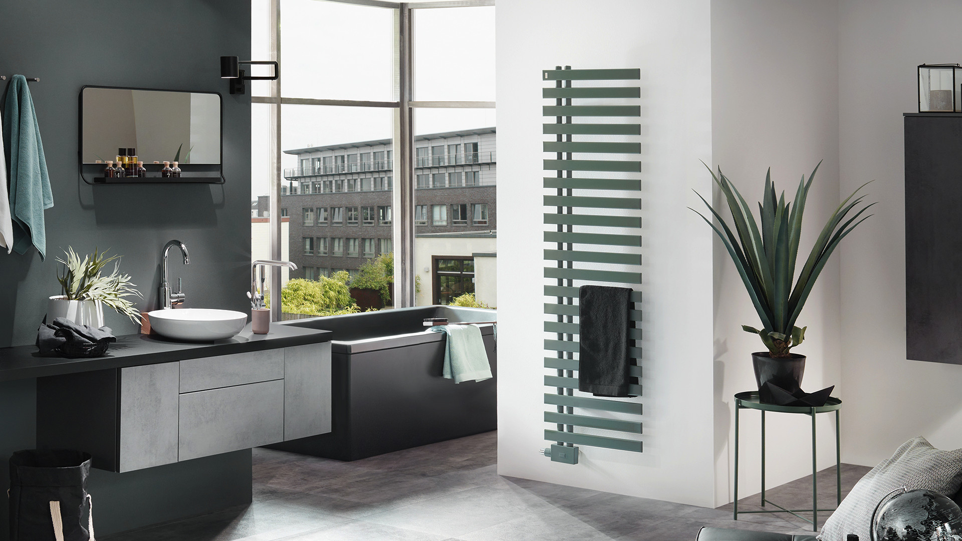 für Zentralheizung und für die Erwärmung von Handtüchern und Textilien, gerade, horizontale Paneelovalrohre 50 x 10 mm im Spezialschweißverfahren mit den vertikalen Rundrohren 30 mm wasserführend verbunden, durchgehend regelmäßig angeordnete Horizontalrohre mit vielen Lücken für das seitliche Einhängen von Handtüchern und Textilien, über Kopf wendbar, wahlweise offene Seite rechts oder links), Vertikal-Rohre im Abstand von 50 mm für Vor- und Rücklauf positioniert, mit Anschlüssen DN 15 x 50 mm einseitig unten und oben, Oberfläche pulverbeschichtet DIN 55900 und bei 180 °C eingebrannt, serienmäßiges Zubehör: 2 Entlüftungsstopfen DN 15 und 4 Befestigungen aus Stahl, mit Sechskant-Holzschrauben und Dübeln, Wärmeleistungen nach DIN EN 442-2, Heizmedium Wasser: max. zul. Betriebstemperatur 100 °C, max. zul. Betriebsüberdruck 4 bar