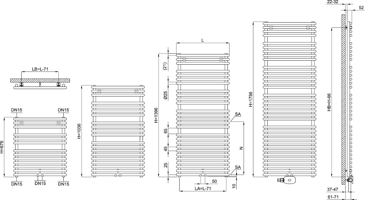 für Zentralheizung (zusätzliche Ausstattung mit Elektroheizstab) und für die Erwärmung von Handtüchern und Textilien, horizontal angeordnete Rundrohre 25 mm mit vertikalen Rundrohren 30 mm verbunden, mit 2-4 Aufnahmeöffnungen für Handtücher, seitliche Rohrenden als Halbkugel geformt, mit M-Anschluss DN 15 x 50 mm mittig unten und 2 Anschlüsse DN 15 von unten und oben, rechts und links außen, Oberfläche pulverbeschichtet DIN 55900 und bei ca. 180 °C eingebrannt, serienmäßiges Zubehör: 2 Entlüftungsstopfen DN 15 sowie 2 Blindstopfen DN 15 in vernickelter Ausführung mit O-Ring, 2 Befestigungen aus Aluminium-Druckguss, pulverbeschichtet im Farbton des Heizkörpers, tiefenverstellbar, erfüllen AK 2-3 nach VDI 6036 je nach Baugröße, mit 2 Sechskant-Holzschrauben und Dübeln sowie Klemmhalter mit Distanzschraube, Wärmeleistung nach DIN EN 442-2, Heizmedium Wasser: max. zul. Betriebstemperatur 100 °C, max. zul. Betriebsüberdruck 10 bar