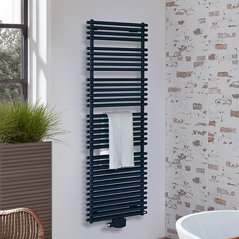 für Zentralheizung (zusätzliche Ausstattung mit Elektroheizstab) und für die Erwärmung von Handtüchern und Textilien, 2-reihig angeordnete horizontale Rundrohre 25 mm mit vertikalen Rundrohren 30 mm verbunden, mit 2-4 Aufnahmeöffnungen für Handtücher, seitliche Rohrenden als Halbkugel geformt, mit M-Anschluss DN 15 x 50 mm mittig unten im vorderen horizontalen Rundrohr (im hinteren bei Austauschversion) und 2 Anschlüsse DN 15 von unten und oben, rechts und links außen, Oberfläche pulverbeschichtet DIN 55900 und bei ca. 180 °C eingebrannt, serienmäßiges Zubehör: 2 Entlüftungsstopfen DN 15 sowie 2 Blindstopfen DN 15 in vernickelter Ausführung mit O-Ring, 4 Befestigungen aus Aluminium-Druckguss, pulverbeschichtet im Farbton des Heizkörpers, tiefenverstellbar, erfüllen AK 3 nach VDI 6036, mit 4 Sechskant-Holzschrauben und Dübeln, Wärmeleistung nach DIN EN 442-2, Heizmedium Wasser, max. zul. Betriebstemperatur 100 °C, max. zul. Betriebsüberdruck 10 bar