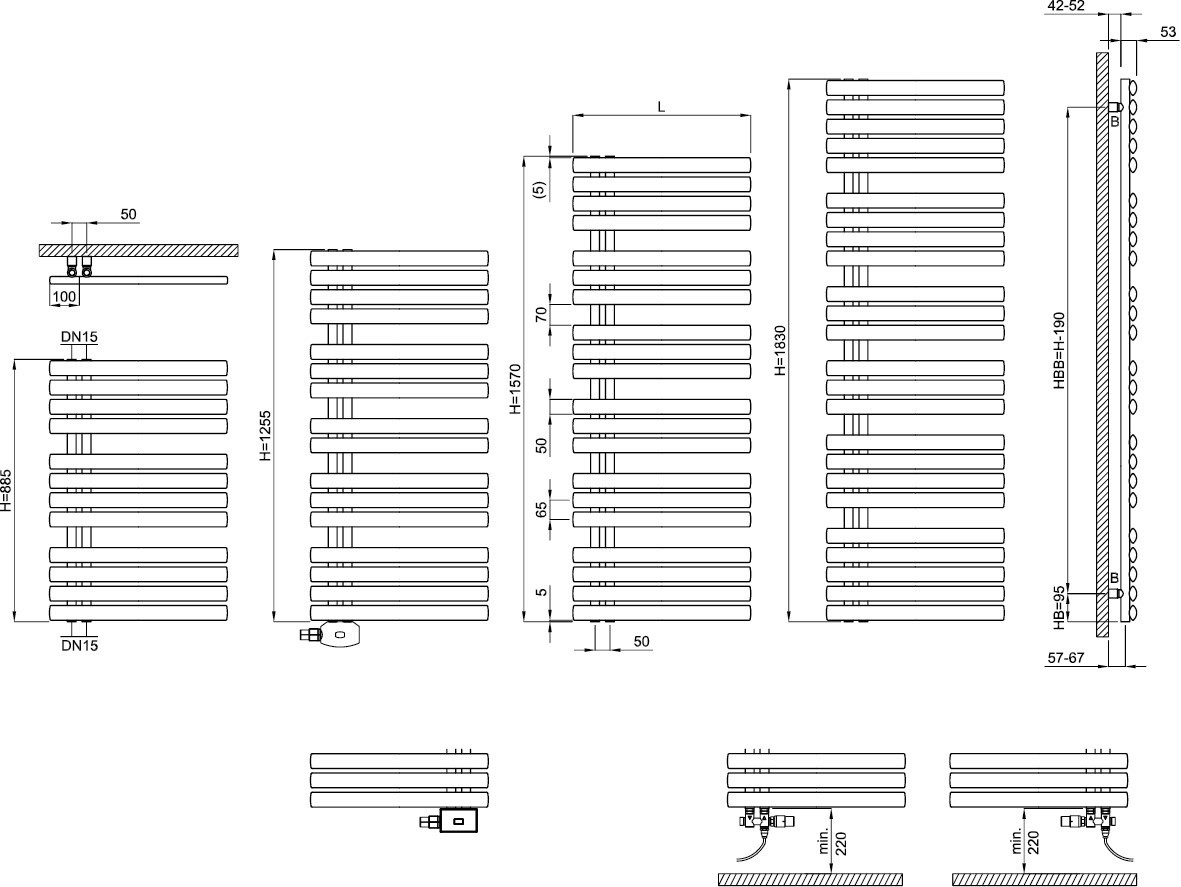 für Zentralheizung (zusätzliche Ausstattung mit Elektroheizstab) und Erwärmung von Handtüchern und Textilien, gerade, horizontale, elipsenförmige Rohre 50 x 25 mm im Spezialschweißverfahren, mit den vertikalen Rundrohren 30 mm wasserführend verbunden, angeordnete Horizontalrohre mit vielen Aufnahmeöffnungen für das seitliche Einhängen von Handtüchern und Textilien, über Kopf wendbar (wahlweise offene Seite rechts oder links), Vertikal-Rohre im Abstand von 50 mm für Vor- und Rücklauf positioniert, mit Anschlüssen DN 15 (1/2") x 50 mm einseitig unten und oben, Oberfläche pulverbeschichtet DIN 55900 und bei ca. 180 °C eingebrannt, serienmäßiges Zubehör: 2 Entlüftungsstopfen DN 15 und 4 Befestigungen aus Stahl, mit Sechskant-Holzschrauben und Dübeln, Wärmeleistungen nach DIN EN 442-2, Heizmedium Wasser, max. zul. Betriebstemperatur 95 °C, max. zul. Betriebsdruck 4 bar