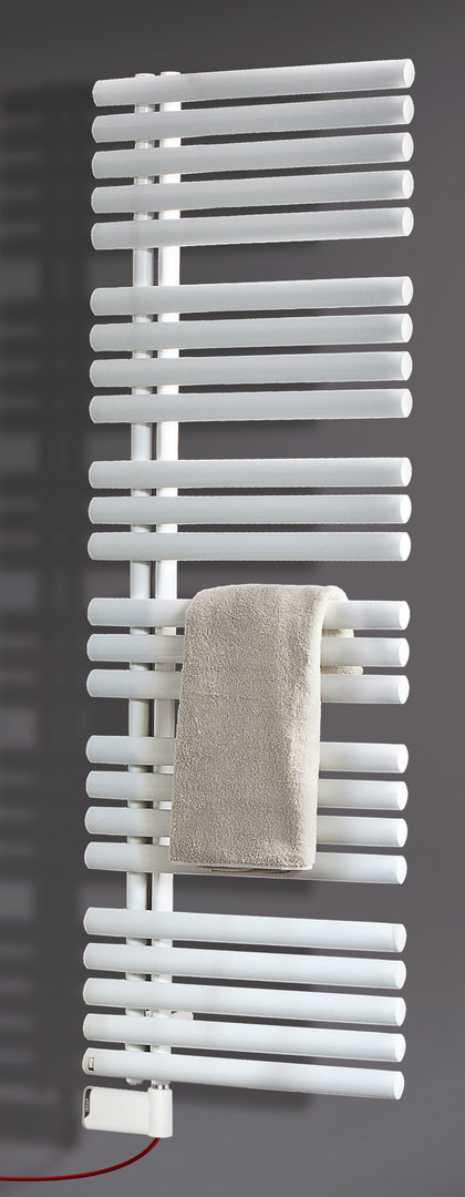 für reinen Elektrobetrieb mit WiFi Smart Heizstab mit Raumtemperaturregelung zur Raumbeheizung und für die Erwärmung von Handtüchern und Textilien, gerade, horizontale, elipsenförmige Rohre 50 x 25 mm im Spezialschweißverfahren mit den vertikalen Rundrohren 30 mm wasserführend verbunden, mit Wärmeträgerflüssigkeit gefüllt (Frostschutz -6 °C), angeordnete Horizontalrohre mit vielen Aufnahmeöffnungen für das seitliche Einhängen von Handtüchern und Textilien, Heizstab serienmäßig unten rechts montiert, nicht genutzte Anschlüsse mit Blindstopfen DN 15 (1/2") mit Innensechskant wasserdicht verschlossen, Oberfläche pulverbeschichtet DIN 55900 und bei ca. 180 °C eingebrannt, Serienmäßiges Zubehör: 4 Befestigungen mit Schrauben und Dübeln, Heizstab in Verbindung mit IRSAP NOW-App ausgestattet mit WiFi Smart-Home-Funktionen, Empfänger und Schalteinheit im Gehäuse, mit Tauchkörper aus Edelstahl mit DN 15 (1/2“) Anschlussgewinde mit O-Ring, Schaltgehäuse mit LED-Temperaturanzeige und ca. 0,8 m rotem Anschlusskabel und Schutzkontaktstecker, Netzspannung 230 V/50 Hz, Klasse II, IP44, Gehäuse aus Kunststoff im Farbton des Heizkörpers lackiert, Maße 140 x 72 x 40 mm